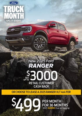 VIN# SLE73905 | STK# 25F1075 | MSRP $43,840 - Payment is based on a 2025 Ford Ranger XLT 4x4 and is a 36-month lease with $499 due at signing in cash or trade equity, security deposit is waived. This lease has a 10,500 miles per year allowance. Cash Back includes $3000 Open Bonus Cash on all models for all buyers. All offers will require approved Ford Credit Financing - not all buyers will qualify. The advertised price, payment, or offer includes all customer charges, including Destination and Delivery charges, except state and local taxes, tags, title, registration, and a $477 dealer documentation fee. Vehicle representations are for illustration purposes only. Offers are good through February 2, 2026.